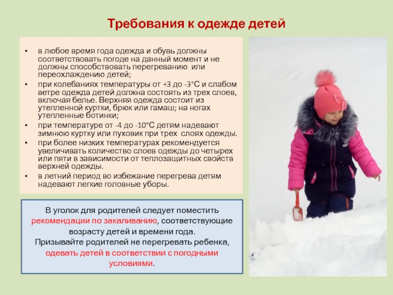 В уголок для родителей следует поместить рекомендации по закаливанию, соответствующие возрасту детей и времени года.