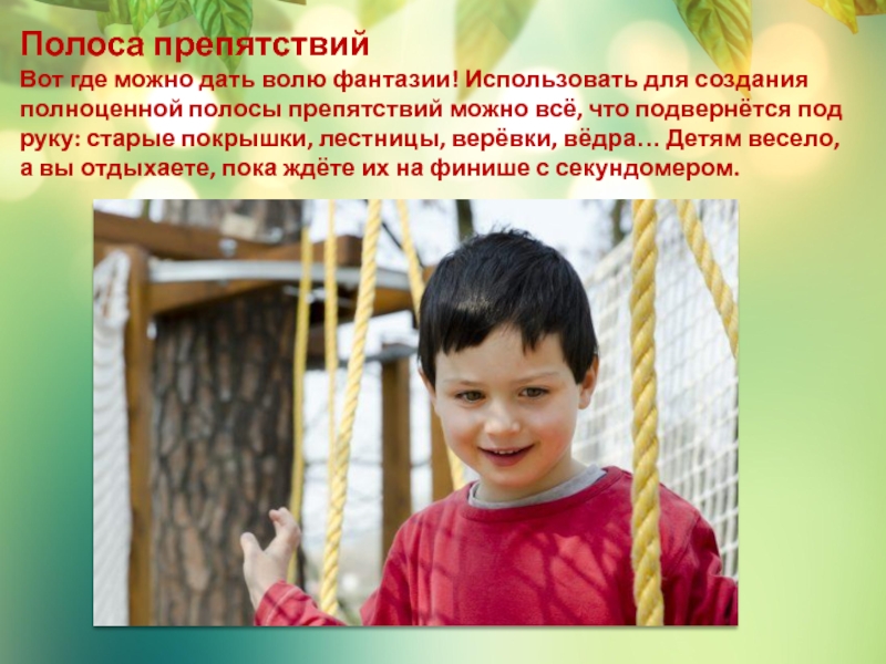 полосы препятствий можно всё, что подвернётся под руку: старые покрышки, лестницы, верёвки, вёдра… Детям весело, а вы отдыхаете, пока ждёте их на финише с секундомером.