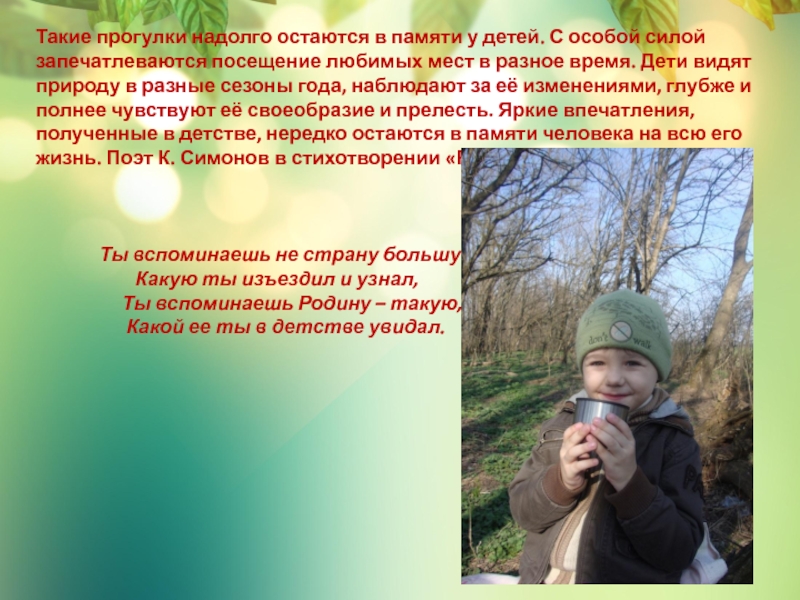 запечатлеваются посещение любимых мест в разное время. Дети видят природу в разные сезоны года, наблюдают за её изменениями, глубже и полнее чувствуют её своеобразие и прелесть. Яркие впечатления, полученные в детстве, нередко остаются в памяти человека на всю его жизнь. Поэт К. Симонов в стихотворении «Родина» пишет: