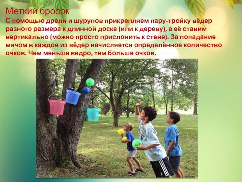 к длинной доске (или к дереву), а её ставим вертикально (можно просто прислонить к стене). За попадание мячом в каждое из вёдер начисляется определённое количество очков. Чем меньше ведро, тем больше очков.