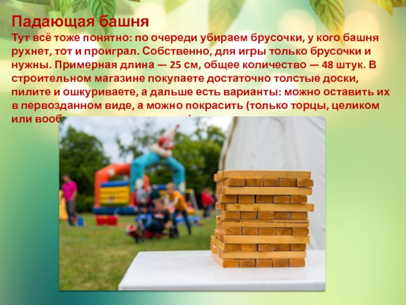 башня рухнет, тот и проиграл. Собственно, для игры только брусочки и нужны. Примерная длина — 25 см, общее количество — 48 штук. В строительном магазине покупаете достаточно толстые доски, пилите и ошкуриваете, а дальше есть варианты: можно оставить их в первозданном виде, а можно покрасить (только торцы, целиком или вообще расписать узорами).