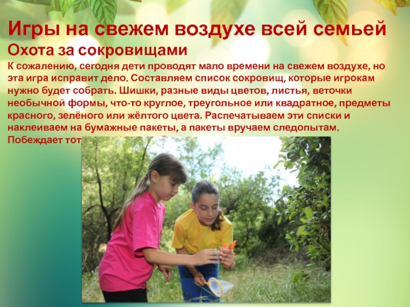 проводят мало времени на свежем воздухе, но эта игра исправит дело. Составляем список сокровищ, которые игрокам нужно будет собрать. Шишки, разные виды цветов, листья, веточки необычной формы, что-то круглое, треугольное или квадратное, предметы красного, зелёного или жёлтого цвета. Распечатываем эти списки и наклеиваем на бумажные пакеты, а пакеты вручаем следопытам. Побеждает тот, кто первым собрал все предметы из списка.