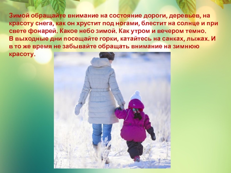 Слайд 4Зимой обращайте внимание на состояние дороги, деревьев, на красоту снега, как