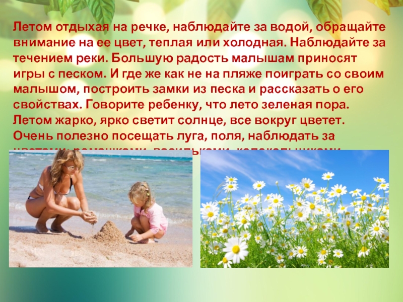 цвет, теплая или холодная. Наблюдайте за течением реки. Большую радость малышам приносят игры с песком. И где же как не на пляже поиграть со своим малышом, построить замки из песка и рассказать о его свойствах. Говорите ребенку, что лето зеленая пора. Летом жарко, ярко светит солнце, все вокруг цветет. Очень полезно посещать луга, поля, наблюдать за цветами: ромашками, васильками, колокольчиками.