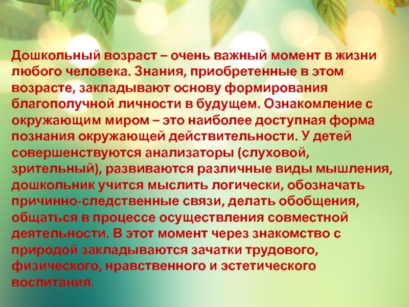 приобретенные в этом возрасте, закладывают основу формирования благополучной личности в будущем. Ознакомление с окружающим миром – это наиболее доступная форма познания окружающей действительности. У детей совершенствуются анализаторы (слуховой, зрительный), развиваются различные виды мышления, дошкольник учится мыслить логически, обозначать причинно-следственные связи, делать обобщения, общаться в процессе осуществления совместной деятельности. В этот момент через знакомство с природой закладываются зачатки трудового, физического, нравственного и эстетического воспитания.