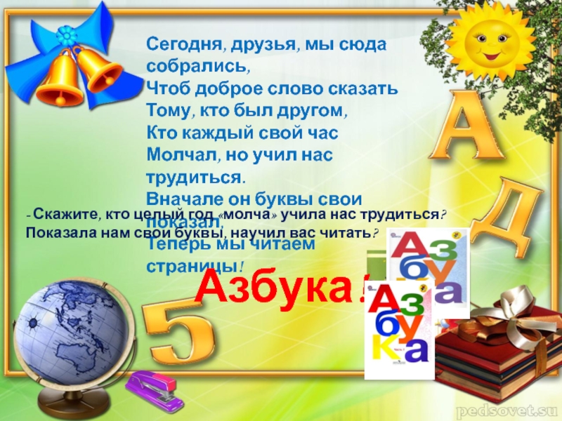 - Скажите, кто целый год «молча» учила нас трудиться? Показала нам свои буквы, научил вас читать?