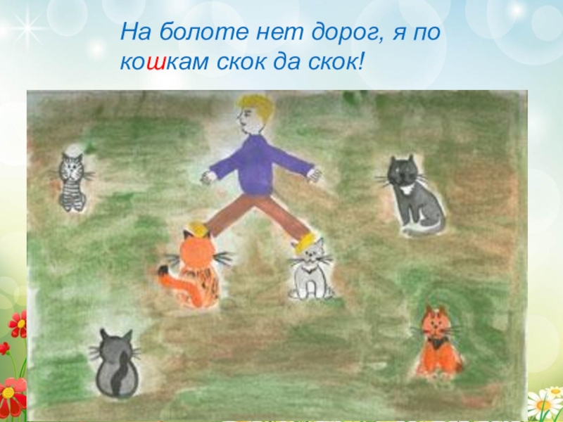 Слайд 16На болоте нет дорог, я по кошкам скок да скок!
