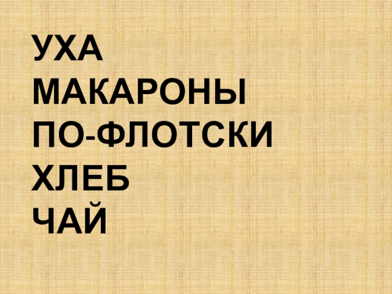 Слайд 8Уха Макароны по-флотски Хлеб Чай