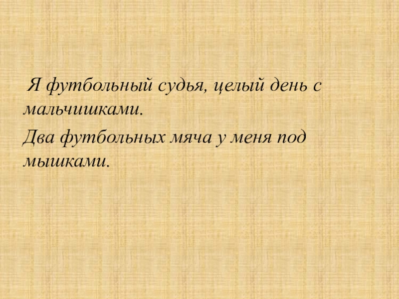 Я футбольный судья, целый день с мальчишками.Два футбольных мяча у меня под мышками.