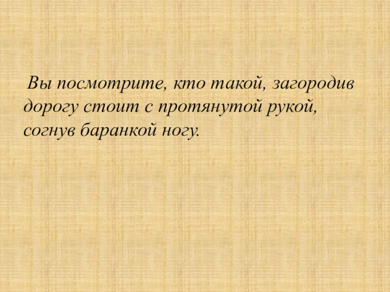 Слайд 15 Вы посмотрите, кто такой, загородив дорогу стоит с протянутой рукой,