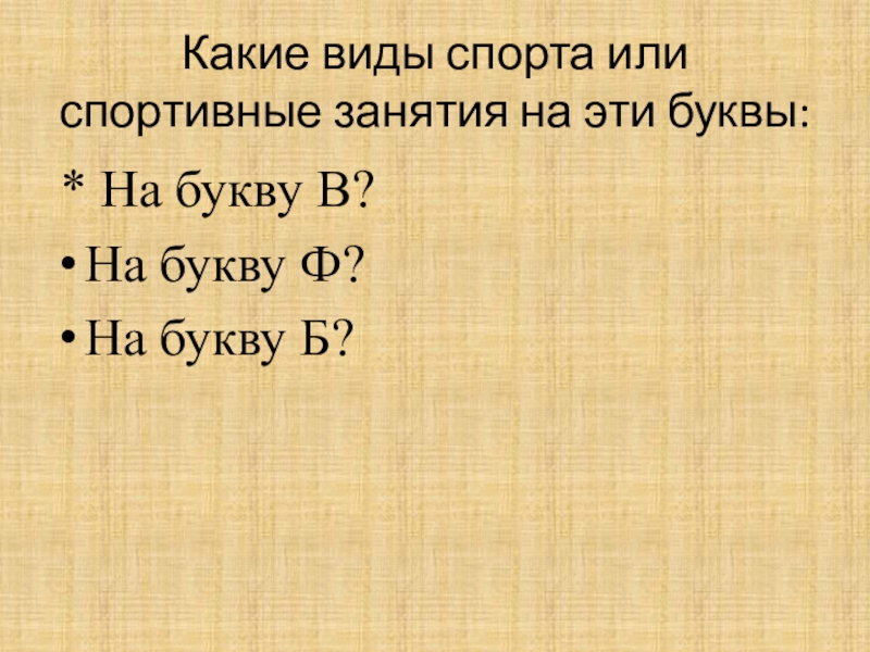 Какие виды спорта или спортивные занятия на эти буквы: * На букву В?На букву Ф?На букву Б?
