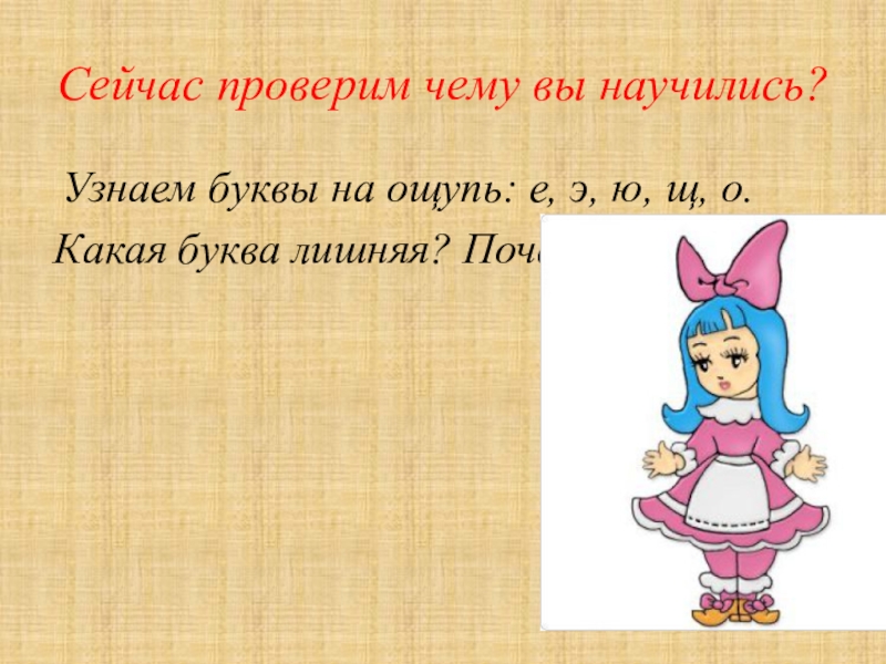 Сейчас проверим чему вы научились? Узнаем буквы на ощупь: е, э, ю, щ, о.Какая буква лишняя? Почему?