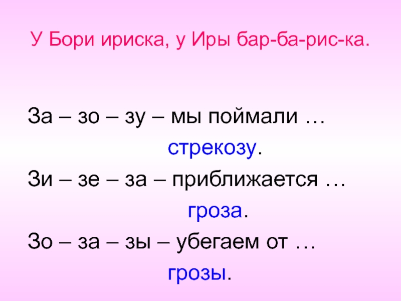 У Бори ириска, у Иры бар-ба-рис-ка.За – зо – зу – мы поймали …							стрекозу.Зи – зе –