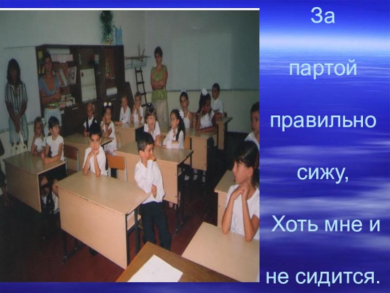 Слайд 3За партой правильно сижу, Хоть мне и не сидится.