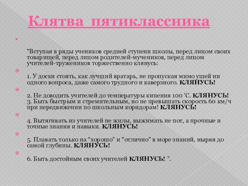 2. Не доводить учителей до температуры кипения 100 'С. КЛЯНУСЬ! 3. Быть быстрым и стремительным, но не превышать скорость 60 км/ч при передвижении по школьным коридорам! КЛЯНУСЬ!