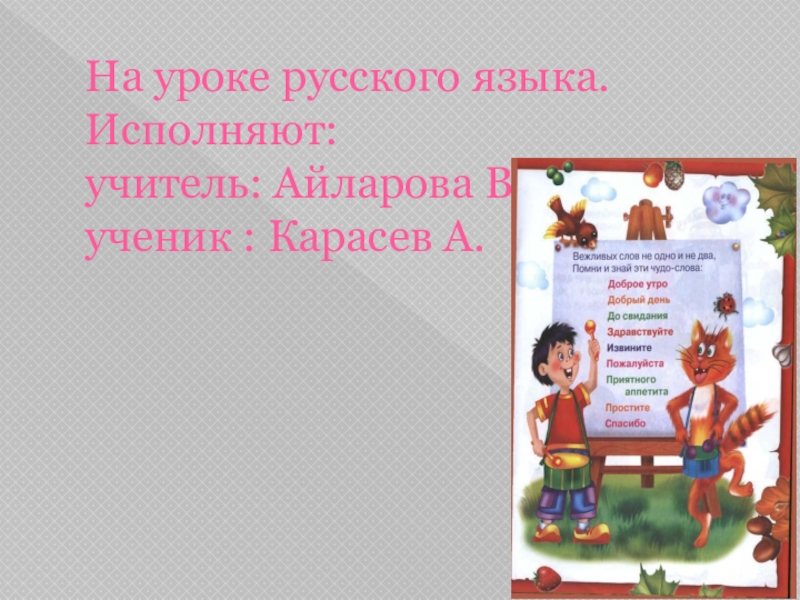 Слайд 5На уроке русского языка. Исполняют: учитель: Айларова В. ученик : Карасев А.