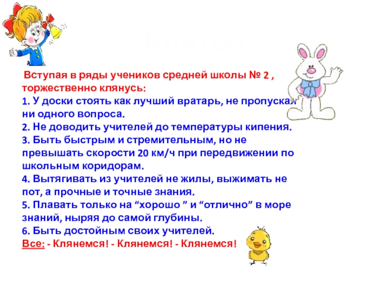 Клятва Вступая в ряды учеников средней школы № 2 , торжественно клянусь:1. У доски стоять как лучший