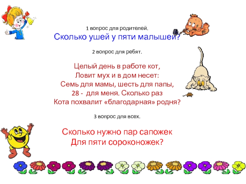 для ребят. Целый день в работе кот, Ловит мух и в дом несет: Семь для мамы, шесть для папы, 28 - для меня. Сколько раз Кота похвалит «благодарная» родня? 3 вопрос для всех. Сколько нужно пар сапожек Для пяти сороконожек?