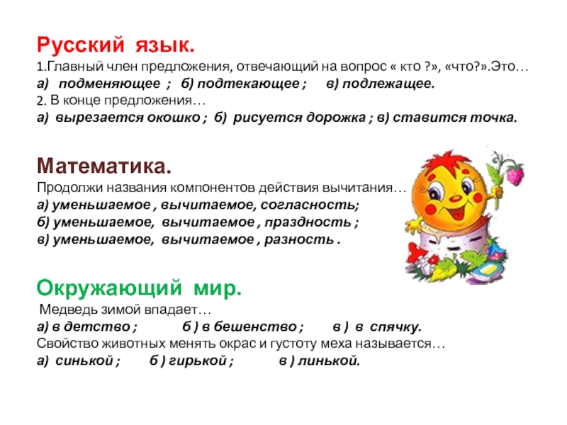 Русский язык.1.Главный член предложения, отвечающий на вопрос « кто ?», «что?».Это…а)  подменяющее ;  б) подтекающее