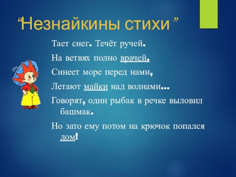 “Незнайкины стихи”Тает снег. Течёт ручей. На ветвях полно врачей. Синеет море перед нами, Летают майки над волнами…