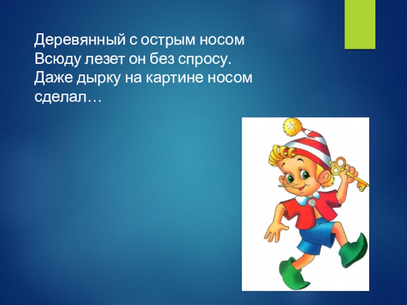 Деревянный с острым носомВсюду лезет он без спросу.Даже дырку на картине носом сделал…