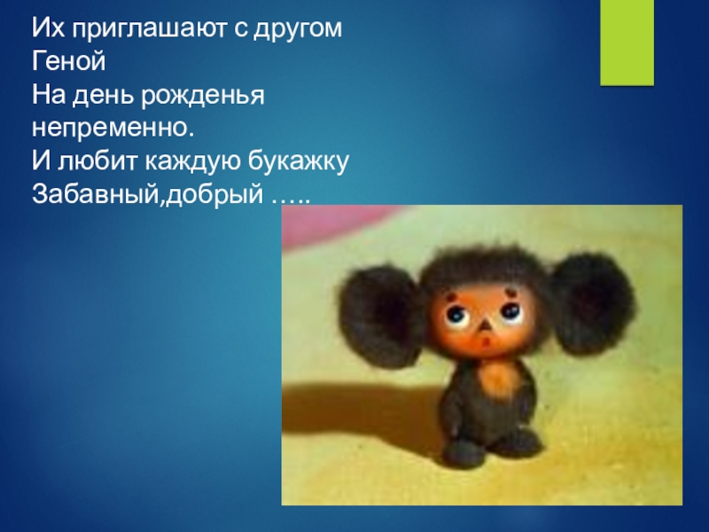 Их приглашают с другом ГенойНа день рожденья непременно.И любит каждую букажкуЗабавный,добрый …..