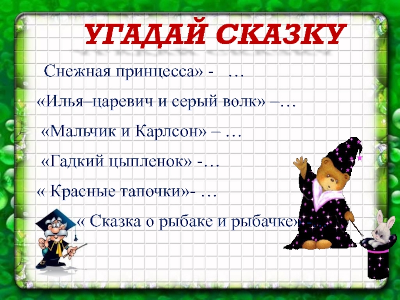 УГАДАЙ СКАЗКУ    «Снежная принцесса» -  …«Илья–царевич и серый волк» –… «Мальчик