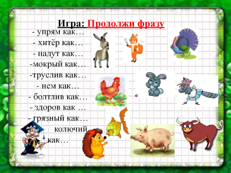 Игра: Продолжи фразу.- упрям как… - хитёр как… - надут как… -мокрый как… -труслив как… - нем