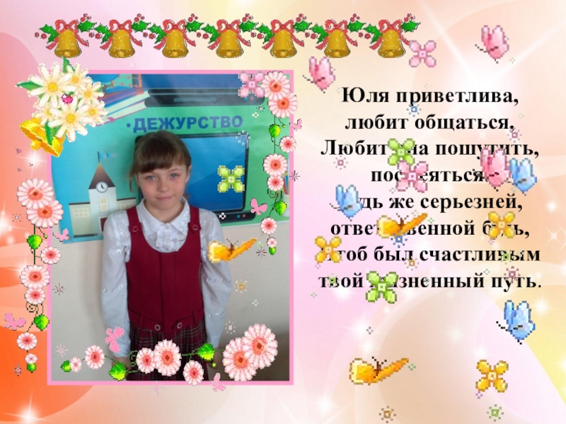 Слайд 51Юля приветлива, любит общаться,