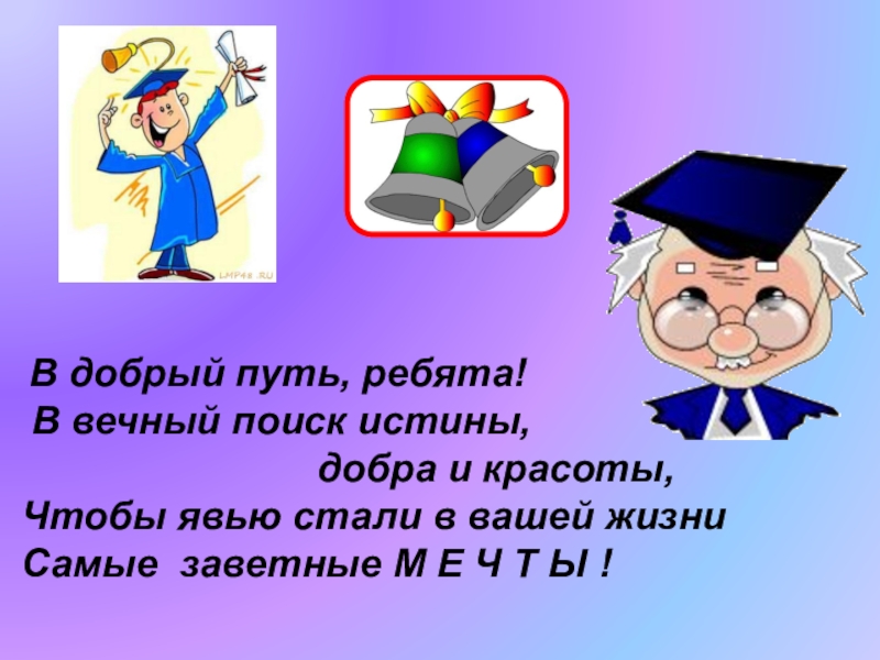 Слайд 9 В добрый путь, ребята! В вечный поиск истины,
