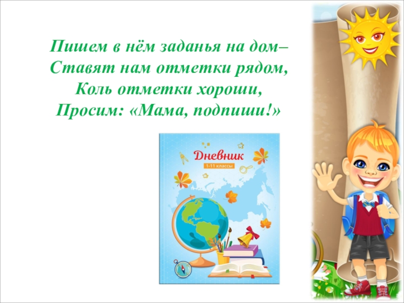 Пишем в нём заданья на дом–Ставят нам отметки рядом,Коль отметки хороши,Просим: «Мама, подпиши!»