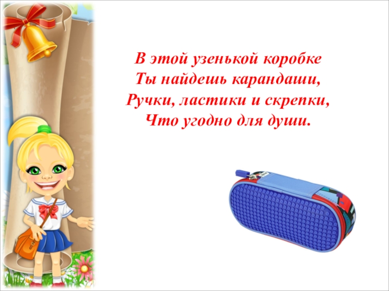 В этой узенькой коробкеТы найдешь карандаши,Ручки, ластики и скрепки, Что угодно для души.