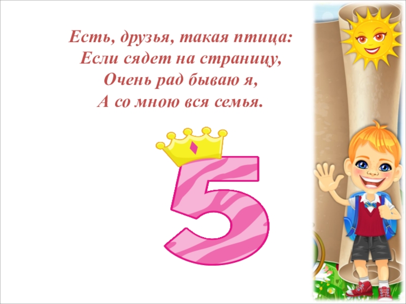 Есть, друзья, такая птица:Если сядет на страницу,Очень рад бываю я,А со мною вся семья.