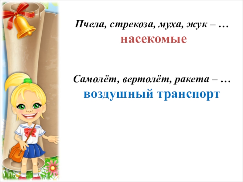 Пчела, стрекоза, муха, жук – … насекомыеСамолёт, вертолёт, ракета – … воздушный транспорт