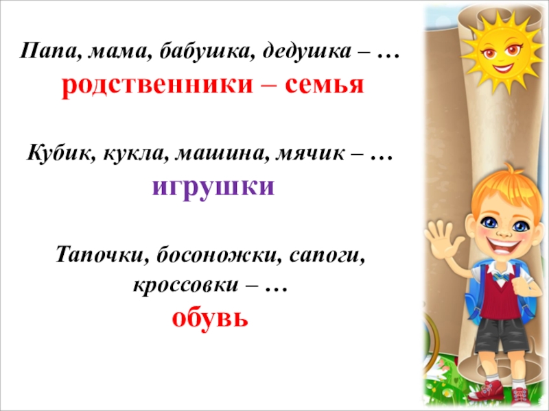 Папа, мама, бабушка, дедушка – … родственники – семьяКубик, кукла, машина, мячик – … игрушкиТапочки, босоножки, сапоги,