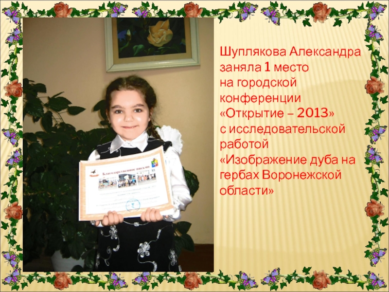 Шуплякова Александра заняла 1 место на городской конференции «Открытие – 2013» с исследовательской работой «Изображение дуба на