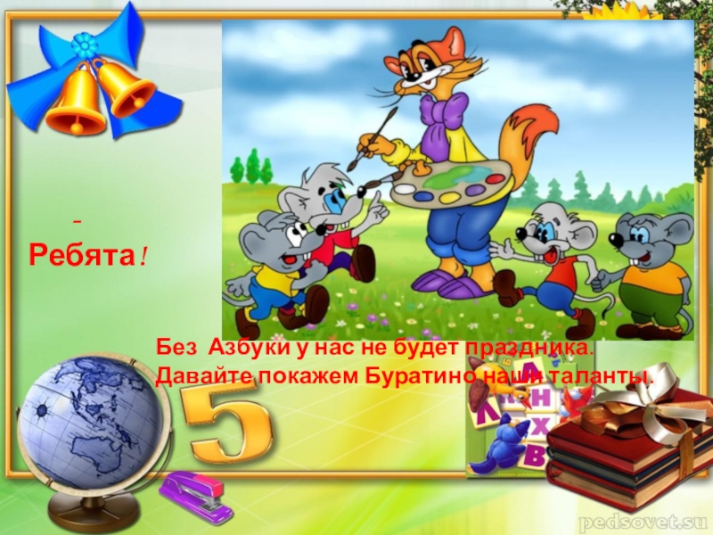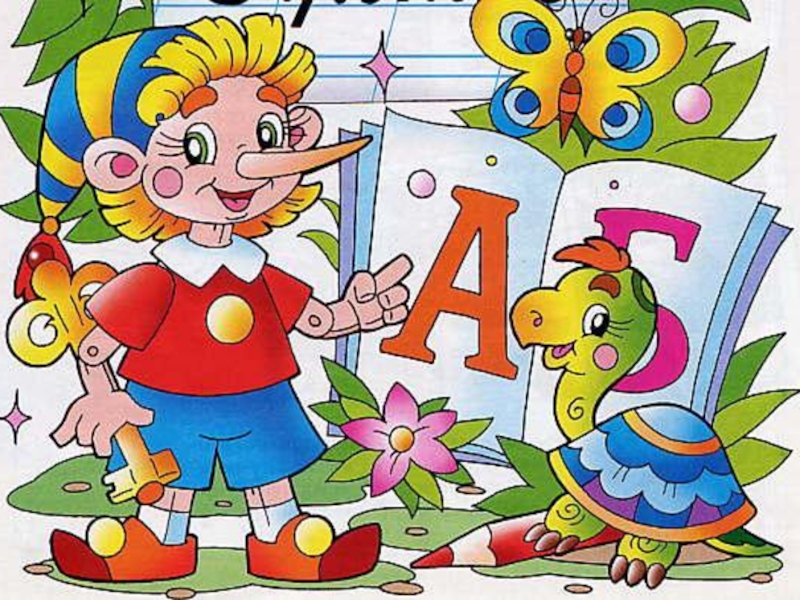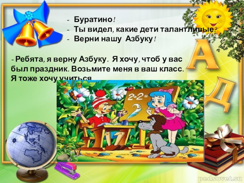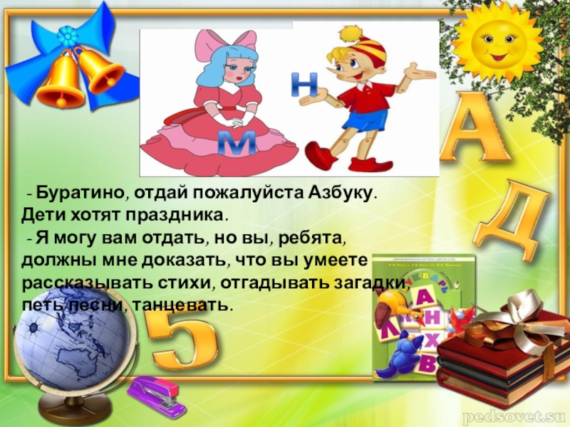 Слайд 13 - Буратино, отдай пожалуйста Азбуку. Дети хотят праздника.