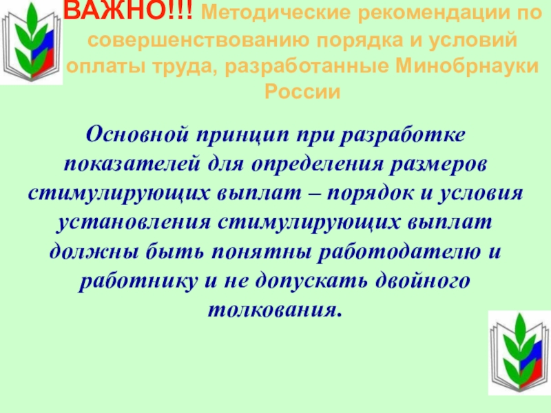 Основной принцип при разработке показателей для определения размеров стимулирующих выплат – порядок и условия установления стимулирующих выплат должны быть понятны работодателю и работнику и не допускать двойного толкования.