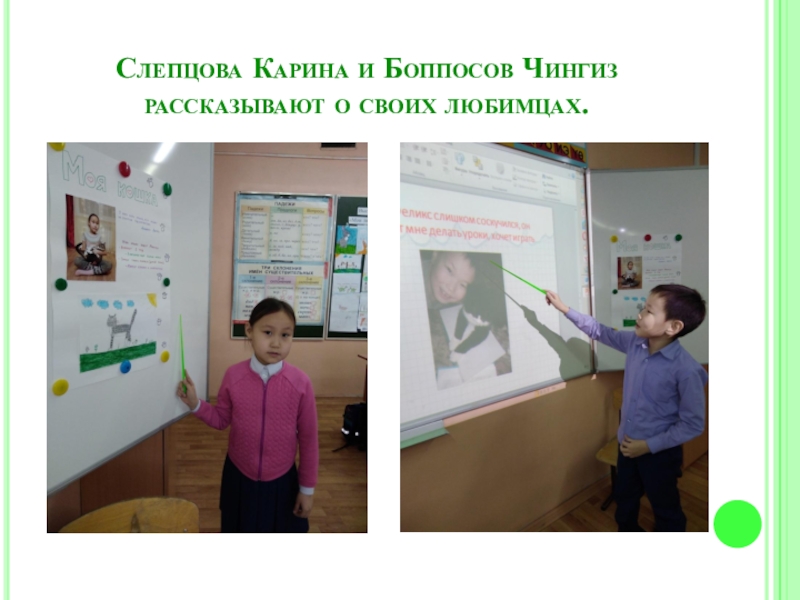 Слайд 11Слепцова Карина и Боппосов Чингиз рассказывают о своих любимцах.