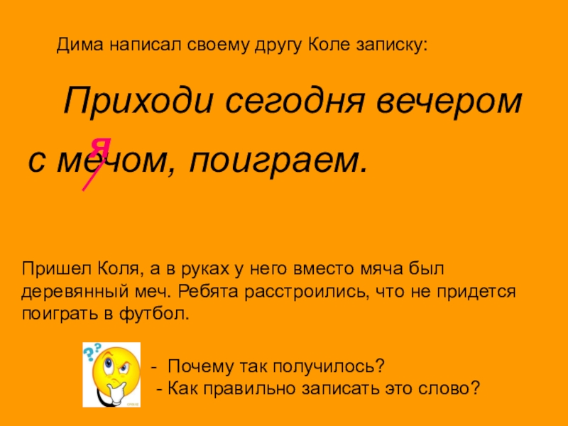 Пришел Коля, а в руках у него вместо мяча был деревянный меч. Ребята расстроились, что не придется поиграть в футбол.