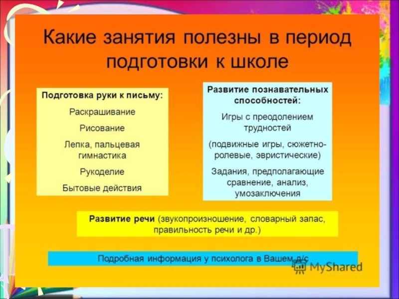 предмета. Оно является основой мышления и практической деятельности как взрослого человека, так и ребенка, основой ориентации человека в окружающем мире, в обществе. образа предмета. Восприятие ребенка дошкольного возраста носит непроизвольный характер. Дети не умеют управлять своим восприятием, не могут самостоятельно анализировать тот или иной предмет. В предметах дошкольники замечают не главные признаки, не самое важное и существенное, а то, что ярко выделяет их на фоне других предметов : окраску, величину, форму.