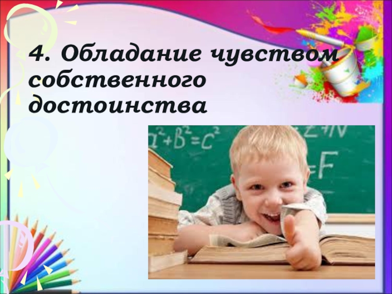 Отношение к самому себе, к своим способнос-тям, к своей деятельности, ее результатам. Иметь адекватную самооценку. Высокая самооценка может вызывать неправильную реакцию на замечания учителя. В результате может оказаться, что "школа плохая", "учитель злой»…
