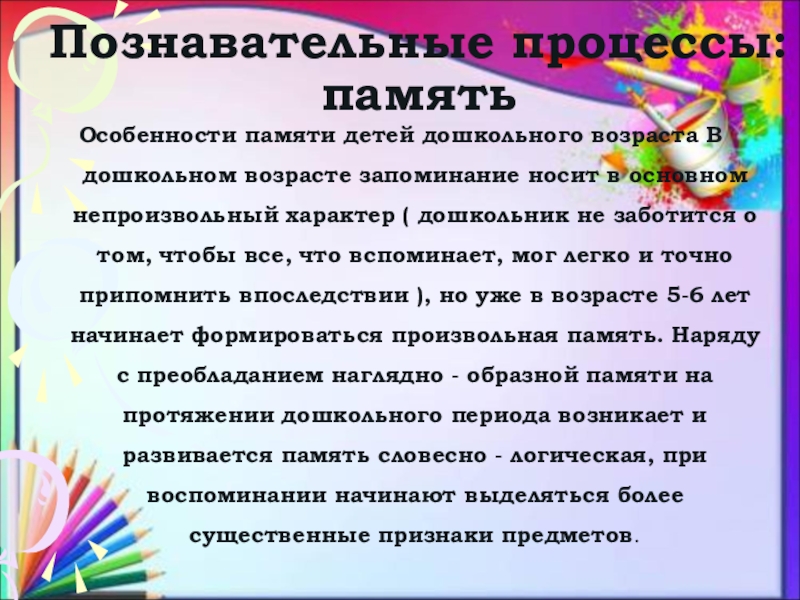 Особенности памяти детей дошкольного возраста В дошкольном возрасте запоминание
