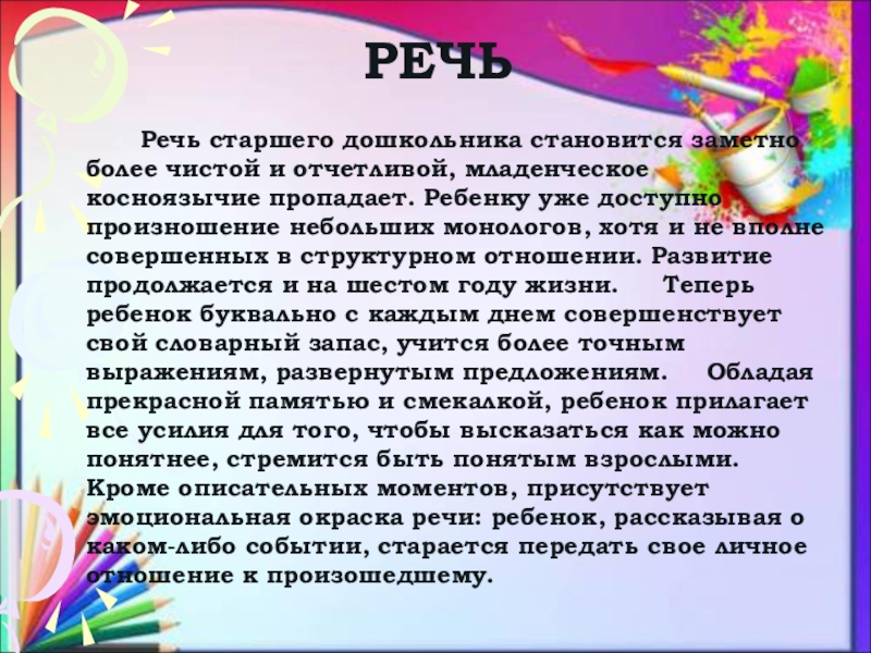 Речь старшего дошкольника становится заметно более чистой и отчетливой, младенческое косноязычие