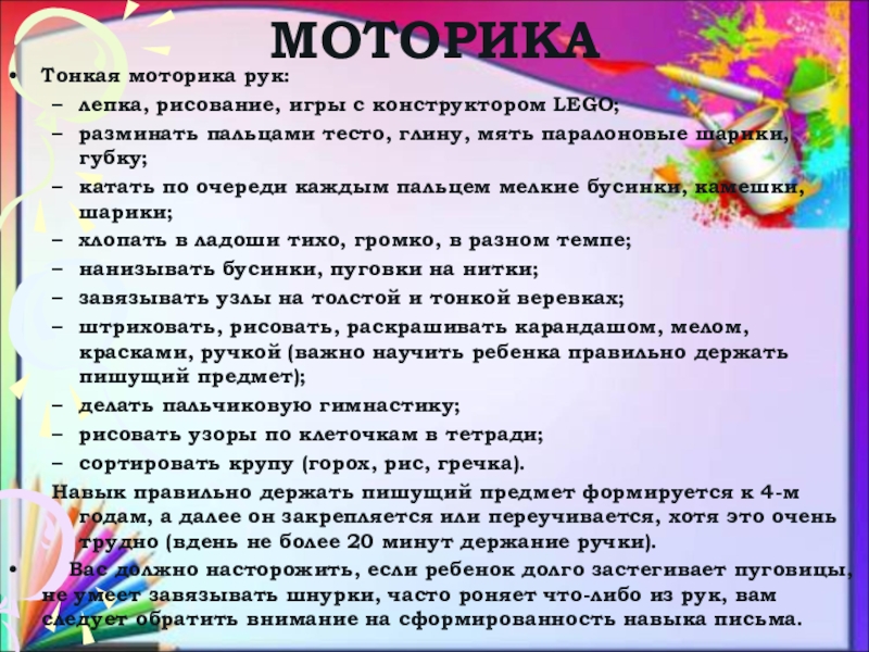 Вас должно насторожить, если ребенок долго застегивает пуговицы, не умеет завязывать шнурки, часто роняет что-либо из рук, вам следует обратить внимание на сформированность навыка письма.