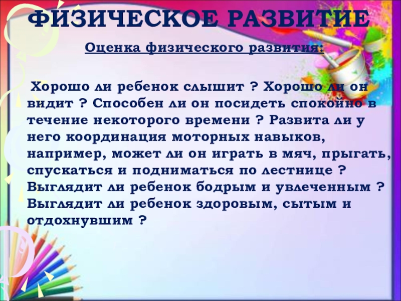 ли он видит ? Способен ли он посидеть спокойно в течение некоторого времени ? Развита ли у него координация моторных навыков, например, может ли он играть в мяч, прыгать, спускаться и подниматься по лестнице ? Выглядит ли ребенок бодрым и увлеченным ? Выглядит ли ребенок здоровым, сытым и отдохнувшим ?