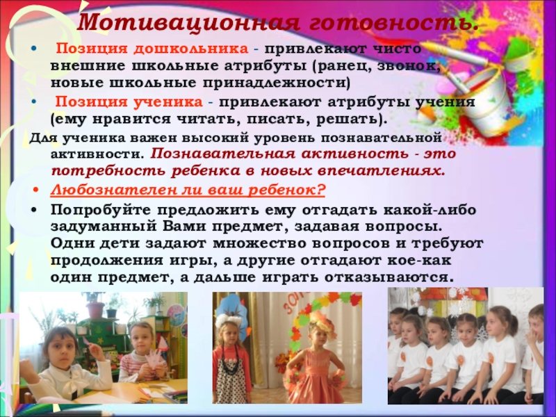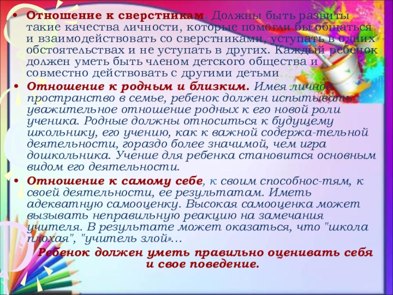 Позиция школьника обязывает занять иное, по сравнению с дошкольником, положение в обществе, с новыми для него правилами. Эта личностная готовность выражается в определенном отношении ребенка к школе, к учителю и учебной деятельности, к сверстникам, родным и близким, к самому себе.