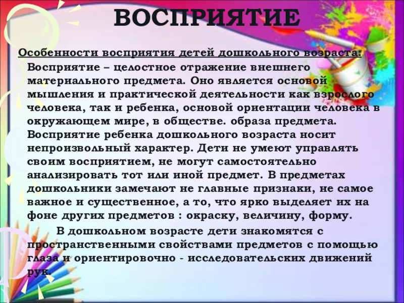 Особенности восприятия детей дошкольного возраста: Восприятие – целостное отражение внешнего материального