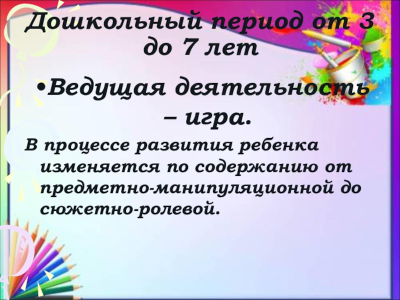 процессе развития ребенка изменяется по содержанию от предметно-манипуляционной до сюжетно-ролевой.
