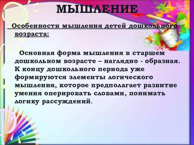 дошкольном возрасте – наглядно - образная. К концу дошкольного периода уже формируются элементы логического мышления, которое предполагает развитие умения оперировать словами, понимать логику рассуждений.